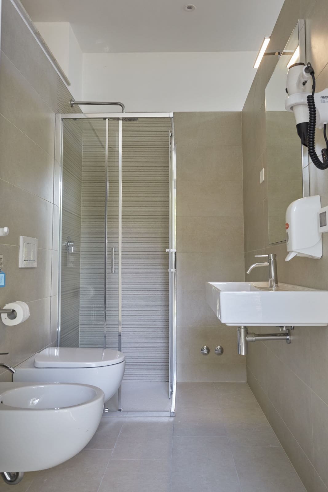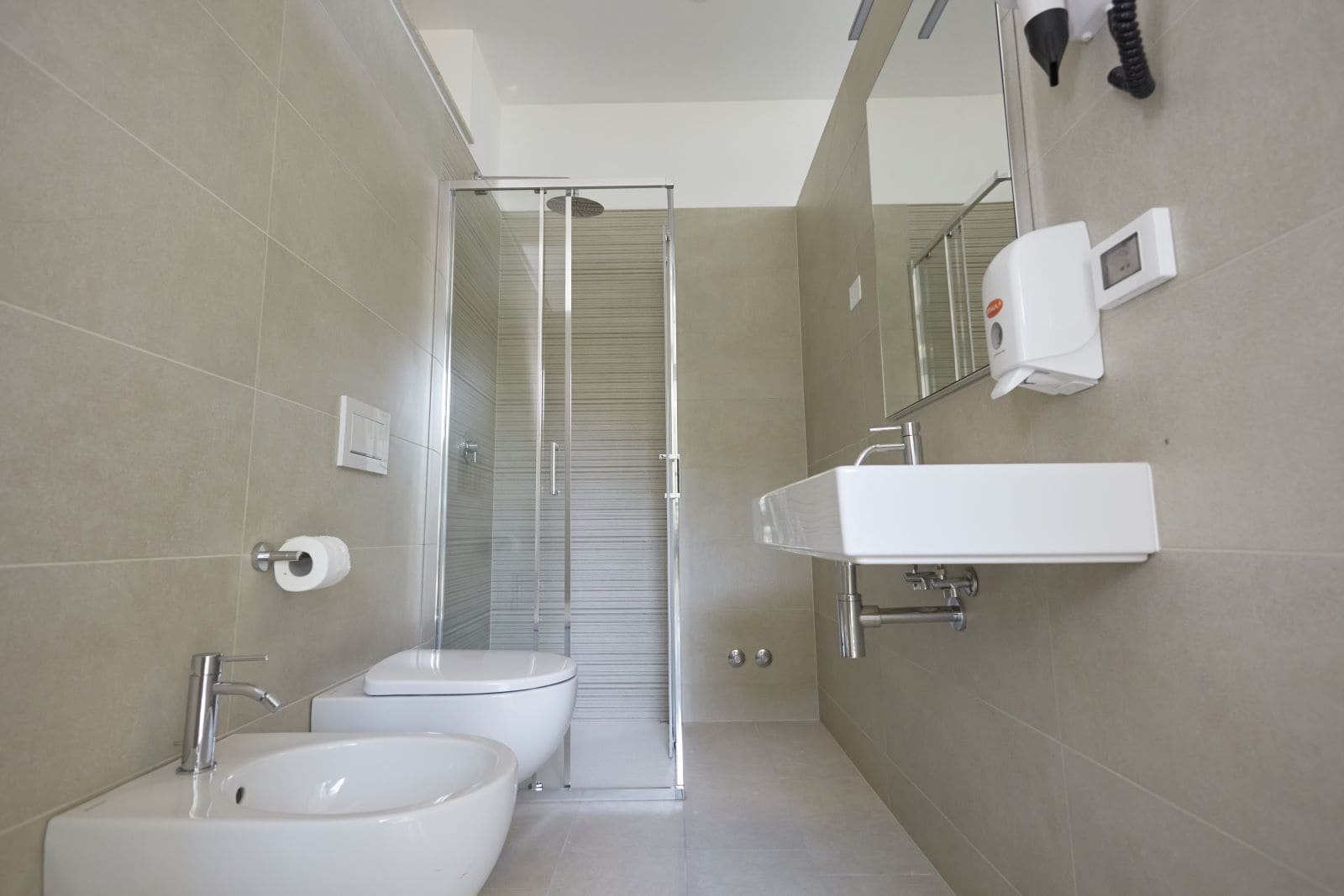 Ogni bagno privato (ca. 4 mq.) viene igienizzato e sanificato giornalmente ed è dotato di lavabo, bidet, wc, angolo doccia, specchio, acqua calda, carta igienica, asciugacapelli e sapone.